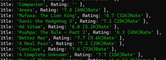 Using each() function we are iterating over all the li tags and extracting Titke and Ratings of all the movies.