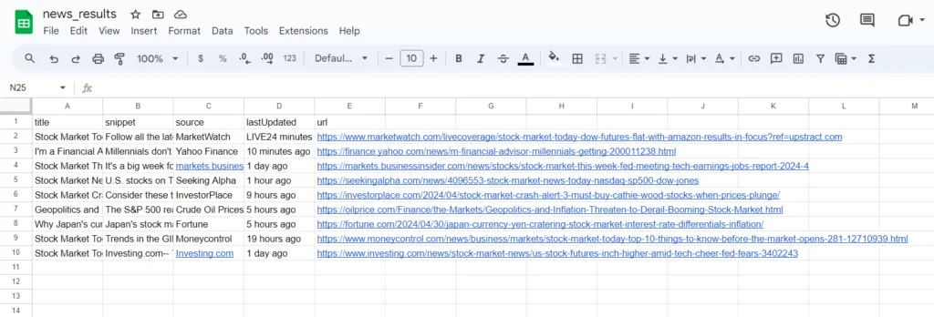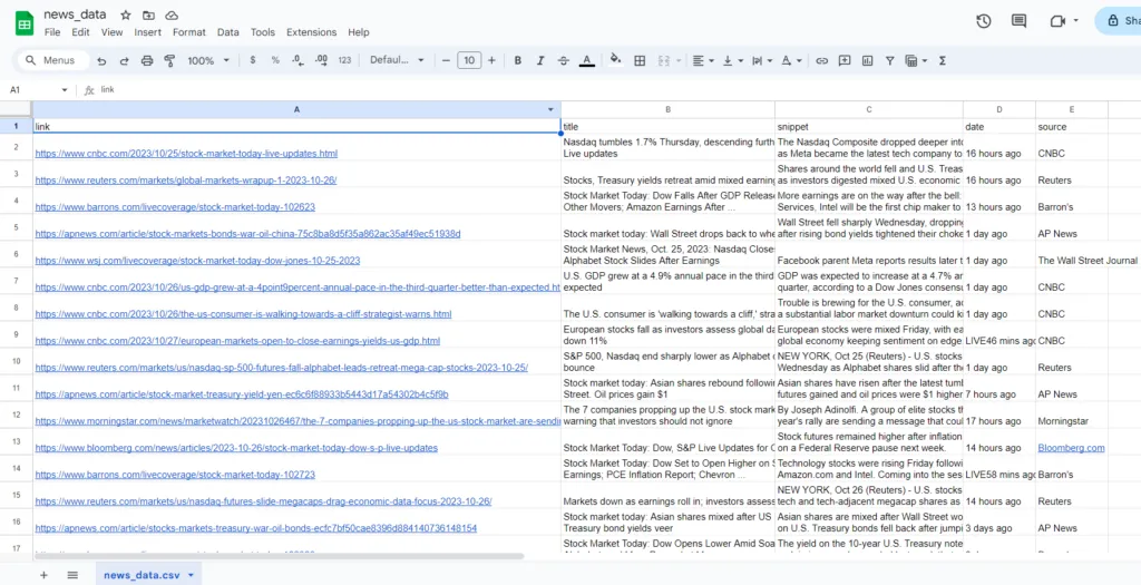 This code will allow us to save the scraped data into a CSV file with columns link, title, snippet, date, and source.