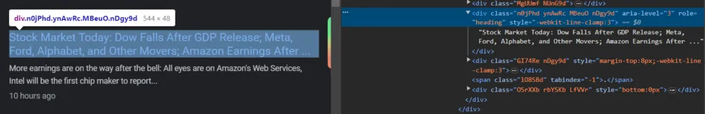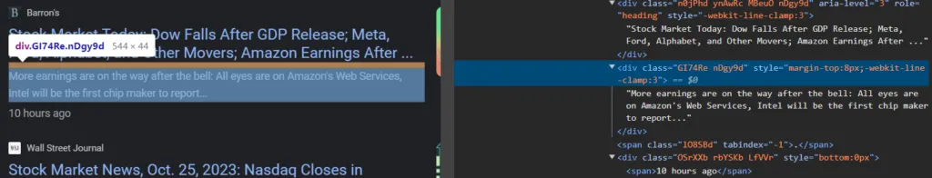 The news description is stored inside the div tag with class GI74Re, and the date is present inside the div tag with the class LfVVr.