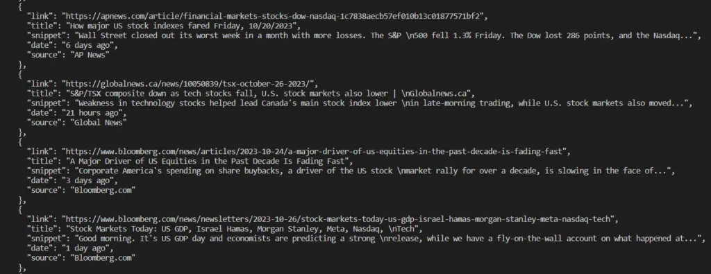 Afterward, we will initialize our API URL to get news results for the topic “stock market”.