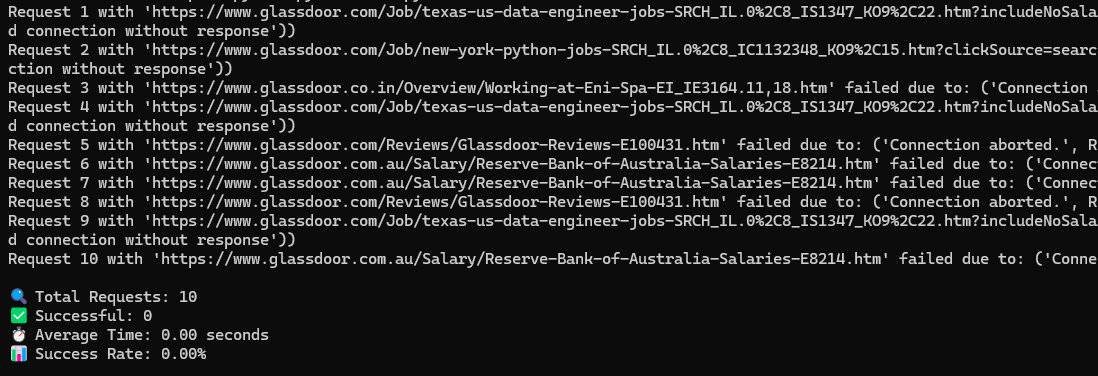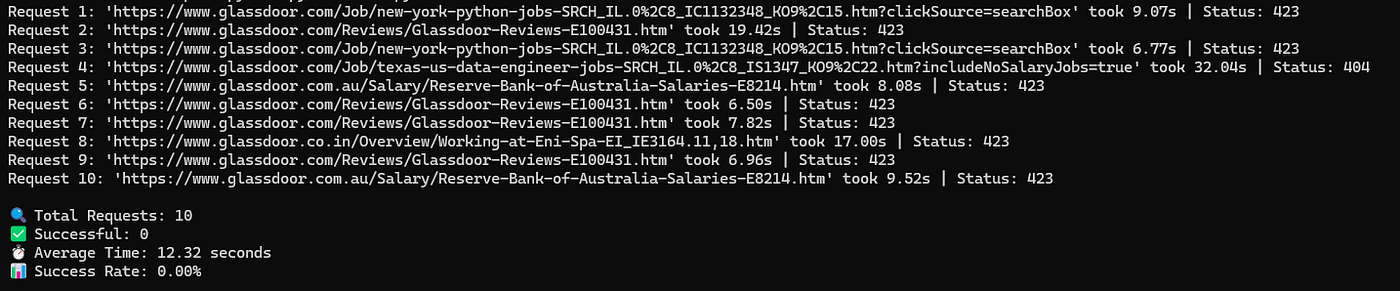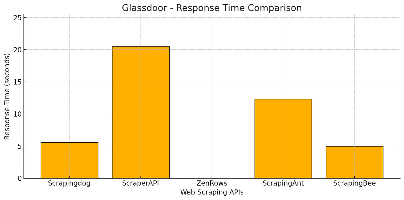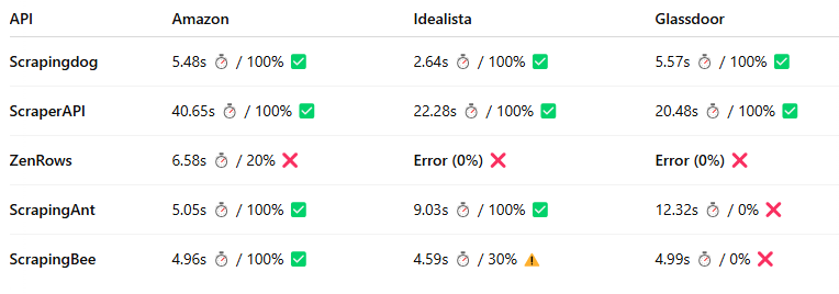 - Glassdoor — Again, ZenRows and ScrapingAnt failed; Scrapingdog remained consistent.