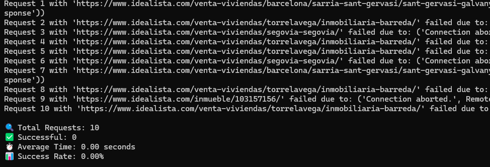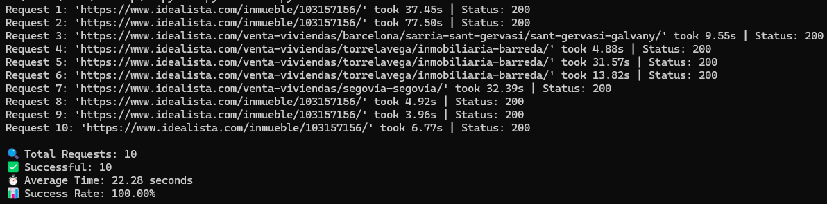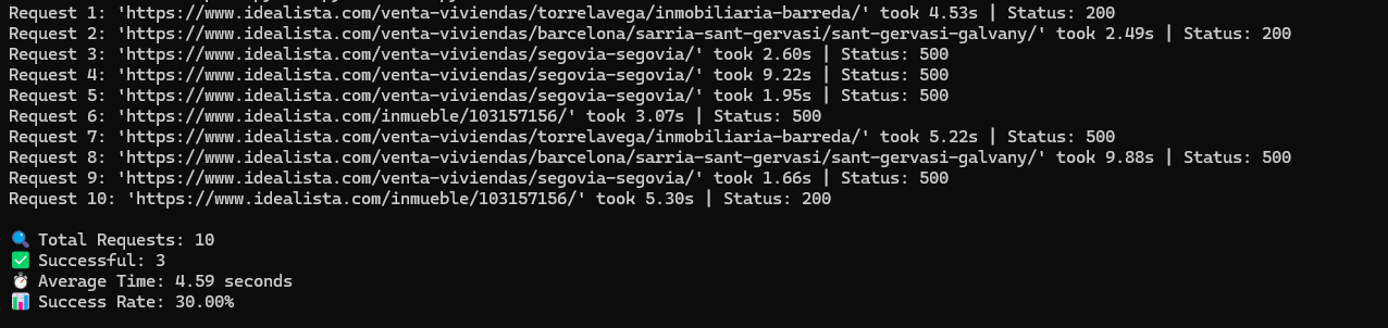 - The response time for Idealista was 4.59 seconds with a success rate of 30%.