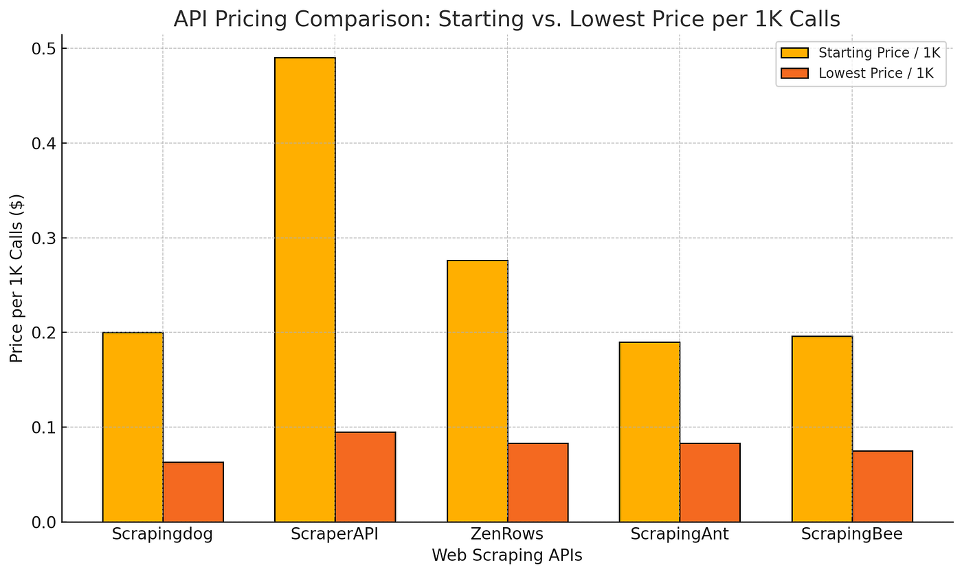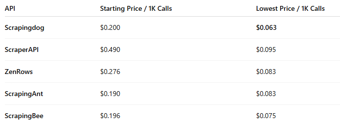 - Scrapingdog has the lowest possible price per 1K ($0.063) at scale.