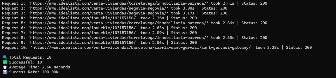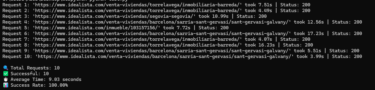 - The response time for Idealista was 9.03 seconds with a success rate of 100%.