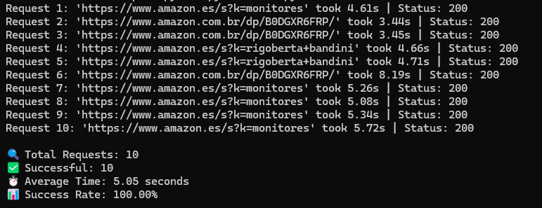 - The average response time while scraping Amazon is 5.05 seconds, and the success rate was 100%.