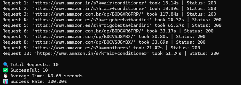 - The average response time while scraping Amazon is 5.48 seconds, and the success rate was 100%.