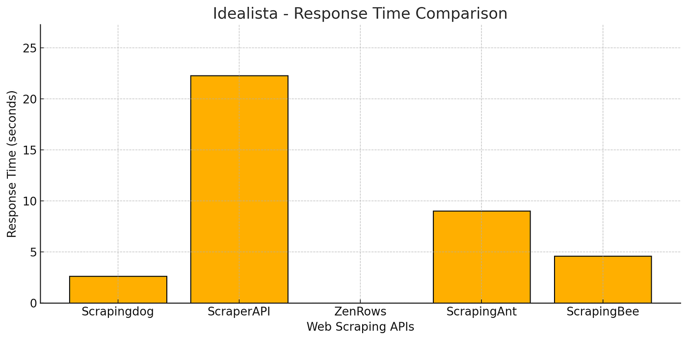 - Idealista — ZenRows failed (0s due to error), while Scrapingdog was the fastest successful response.