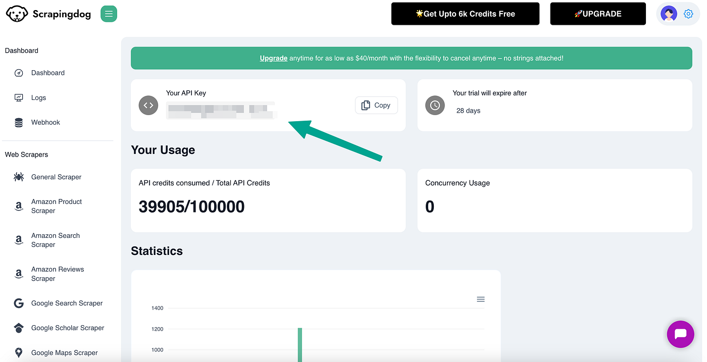 When you sign up, you get your key on the dashboard of the Scrapingdog interface ⬇️