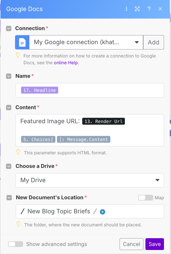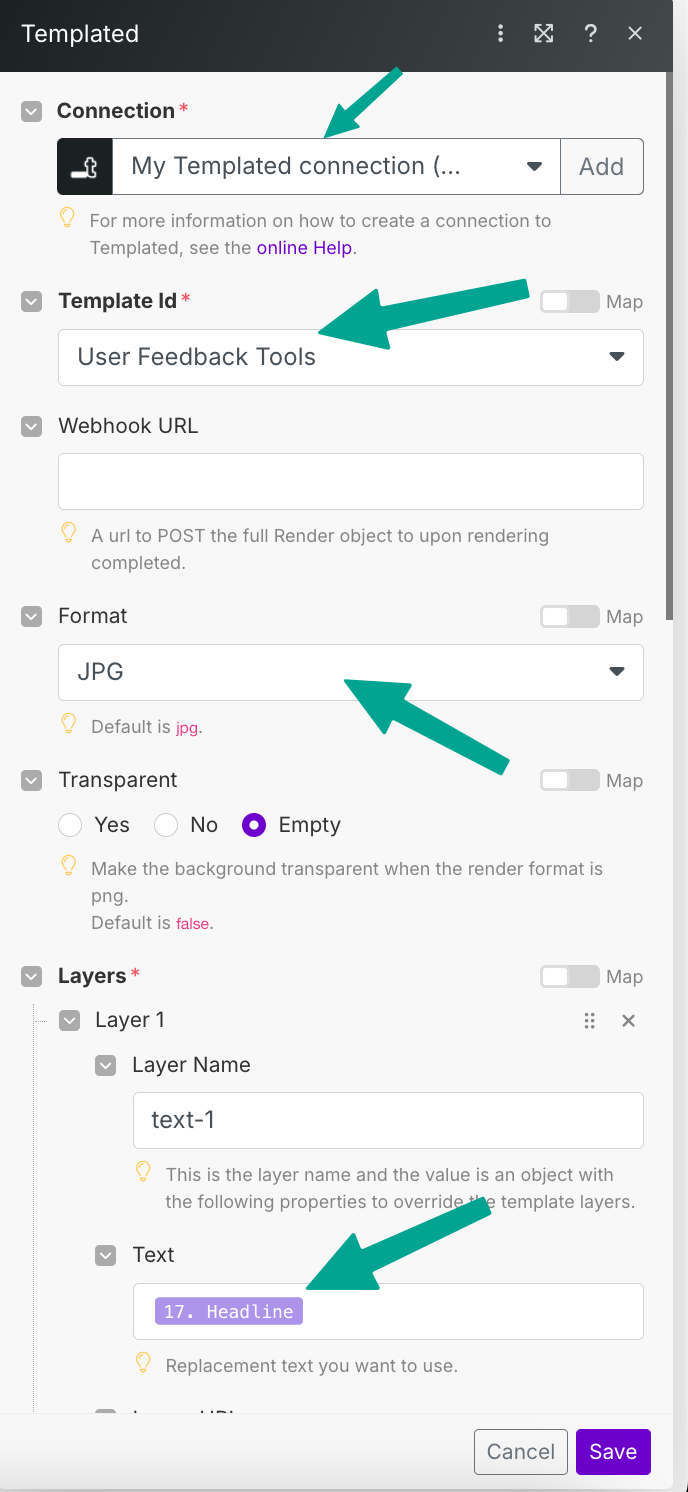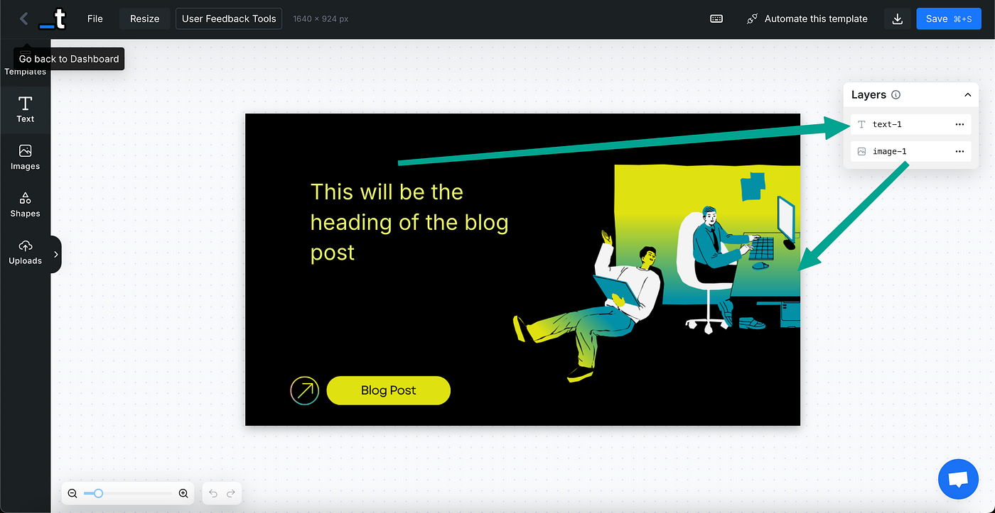 So, the headline we are generating from the last AI module will go in the layer ‘text-1’ every time a new blog is created, and the base template, which is layer ‘image-1’ will remain constant.