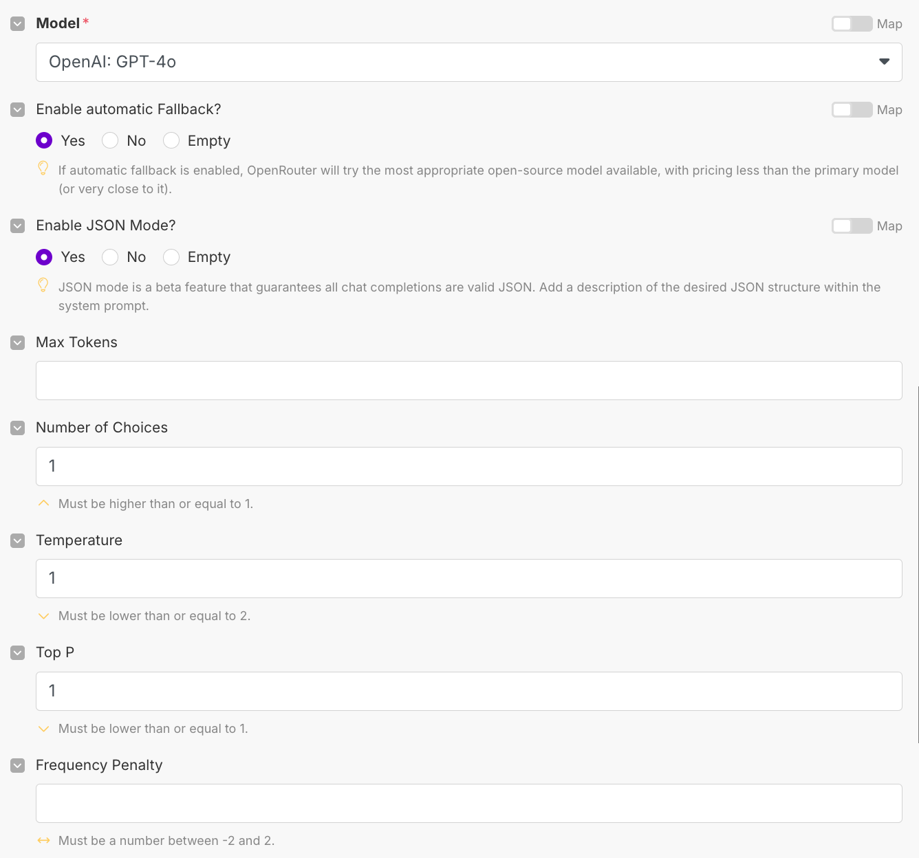 In the advanced setting, I am enabling the fallback, & JSON module (to strict my AI so that it gives the output in JSON format only). The model I am using is OpenAI: GPT-4o since I found that this is the most consistent model. (You can use any model of your choice)