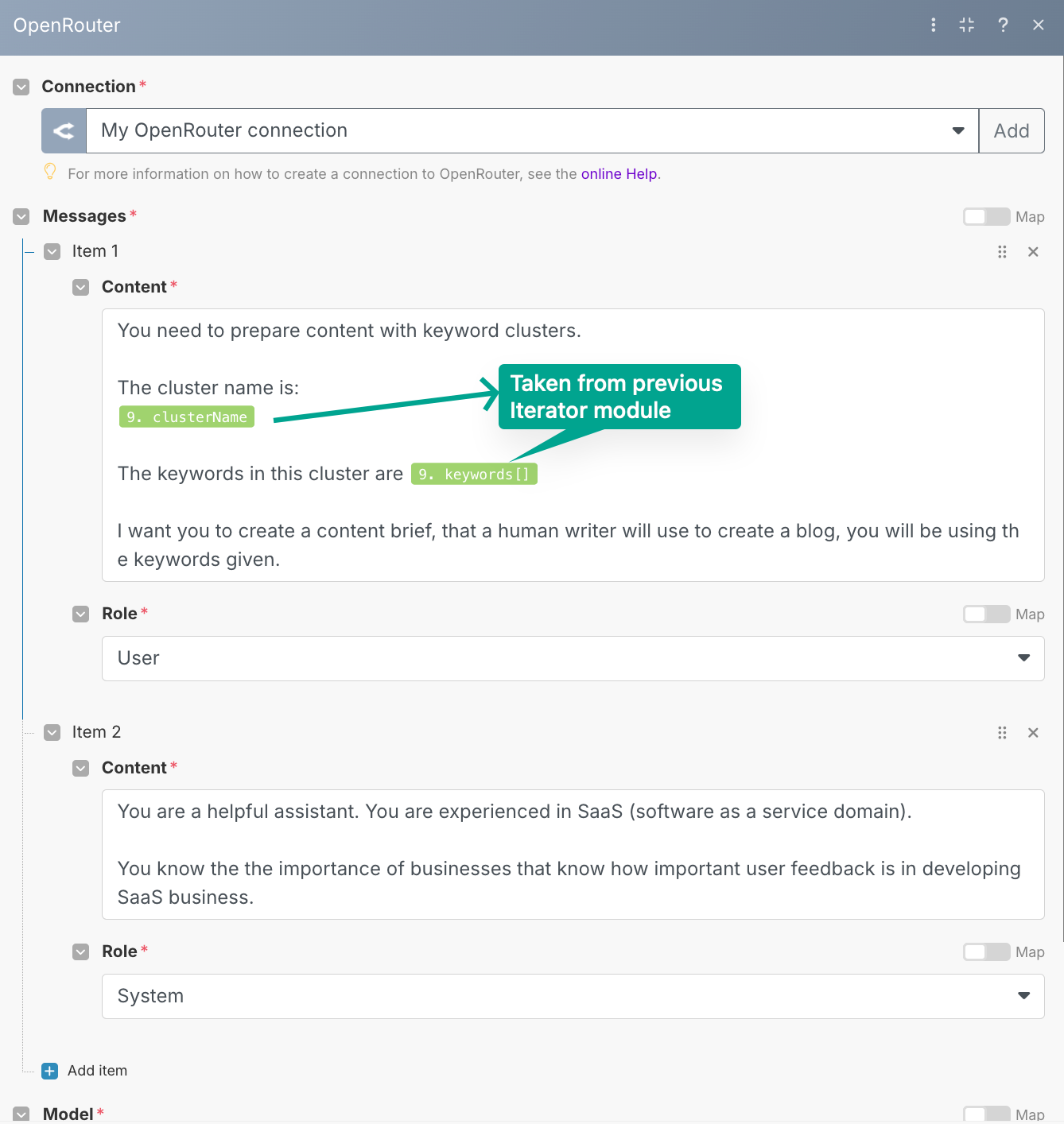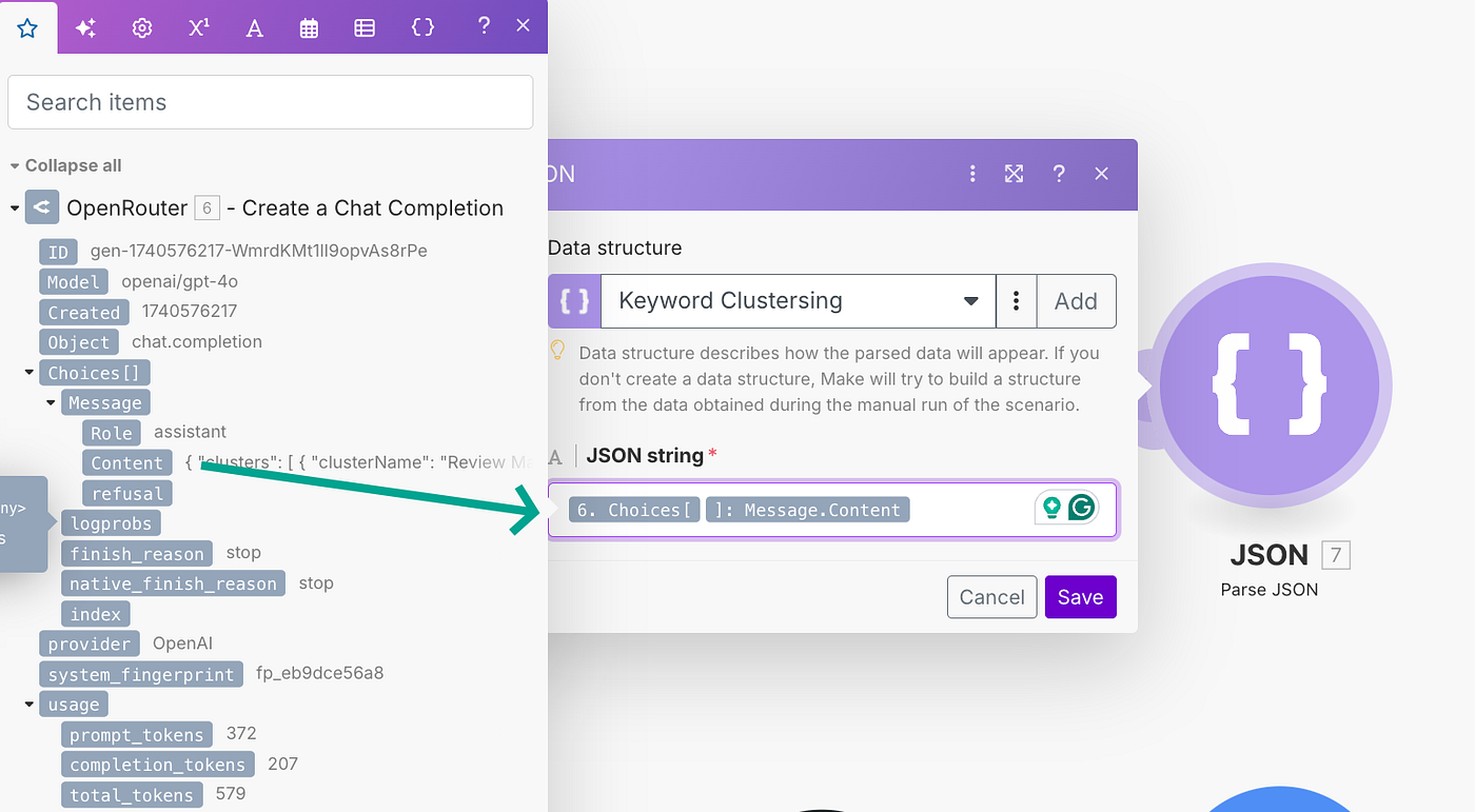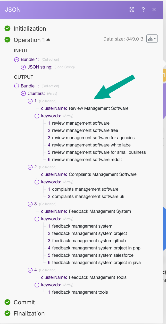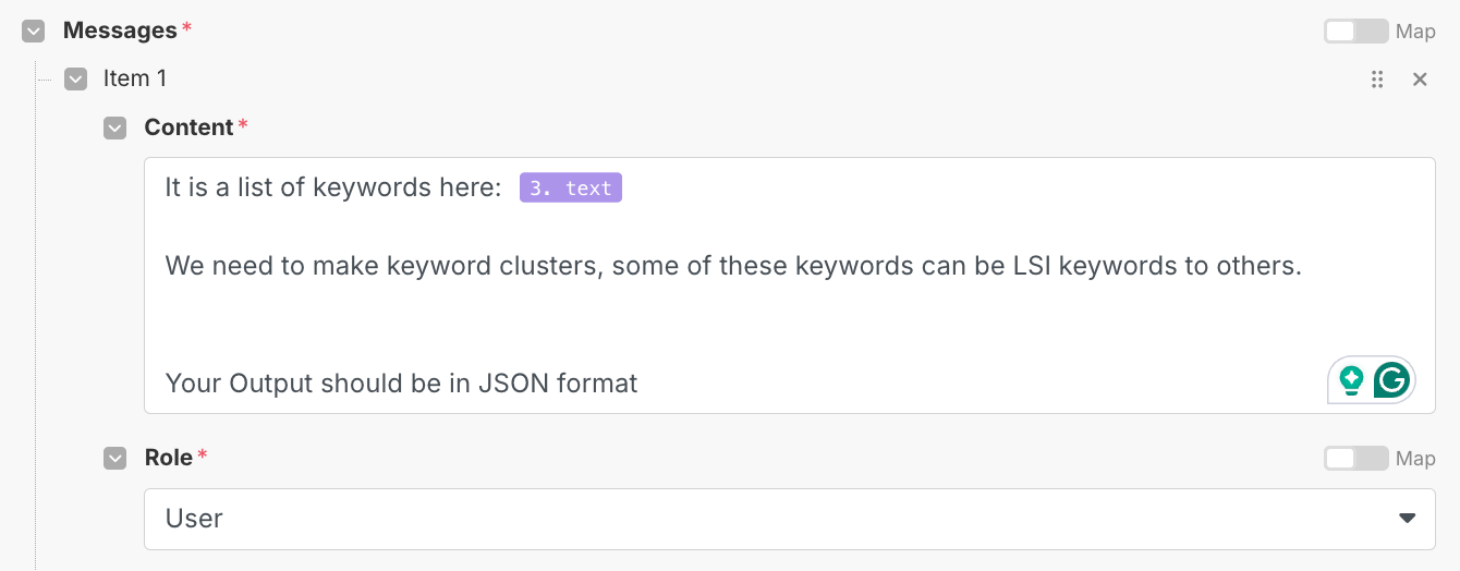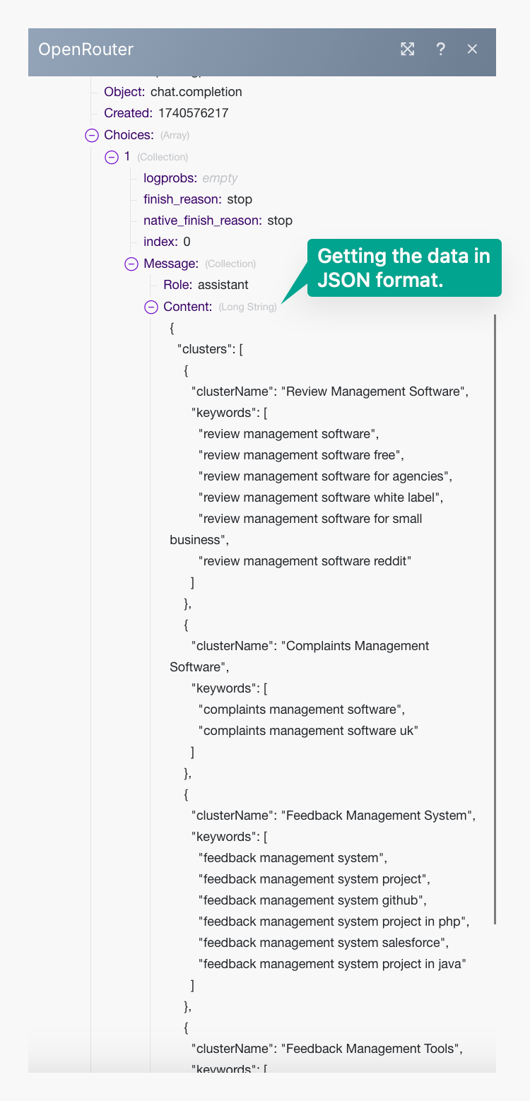 As you can see, we have separated each clusterName with its set of keywords, this way now we can easily feed this detail into our AI model to prepare our content briefings.