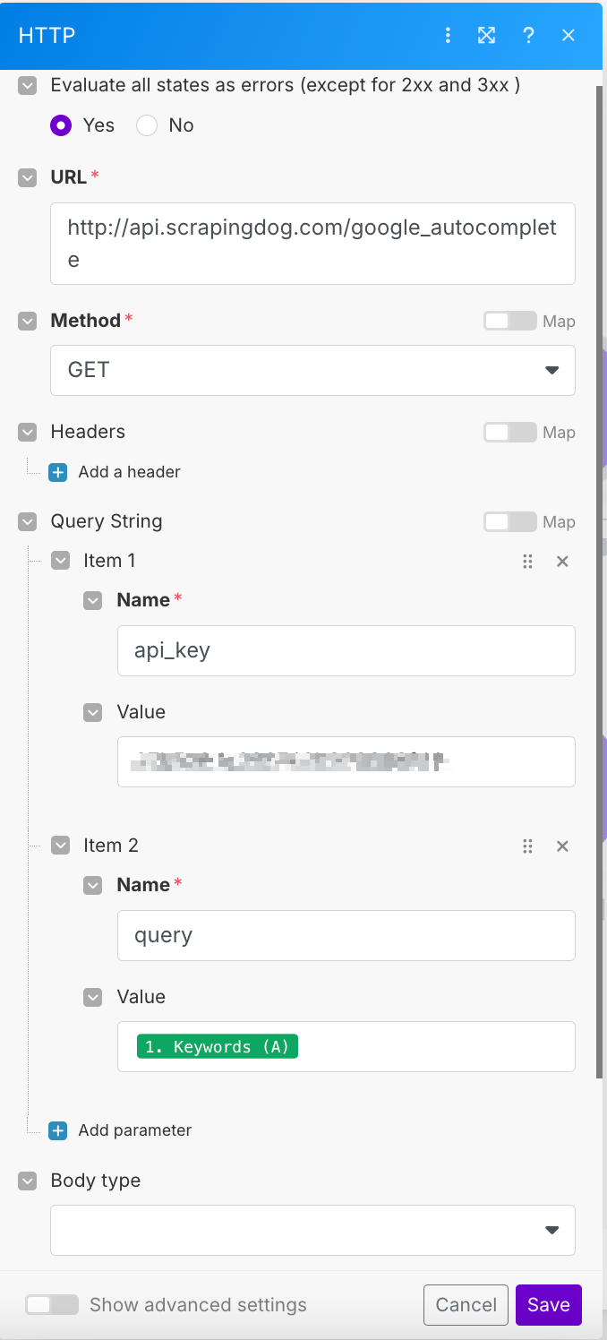 Next, is setting up the HTTP module, where I will set up my Google Autocomplete API setup using Scrapingdog’s API.