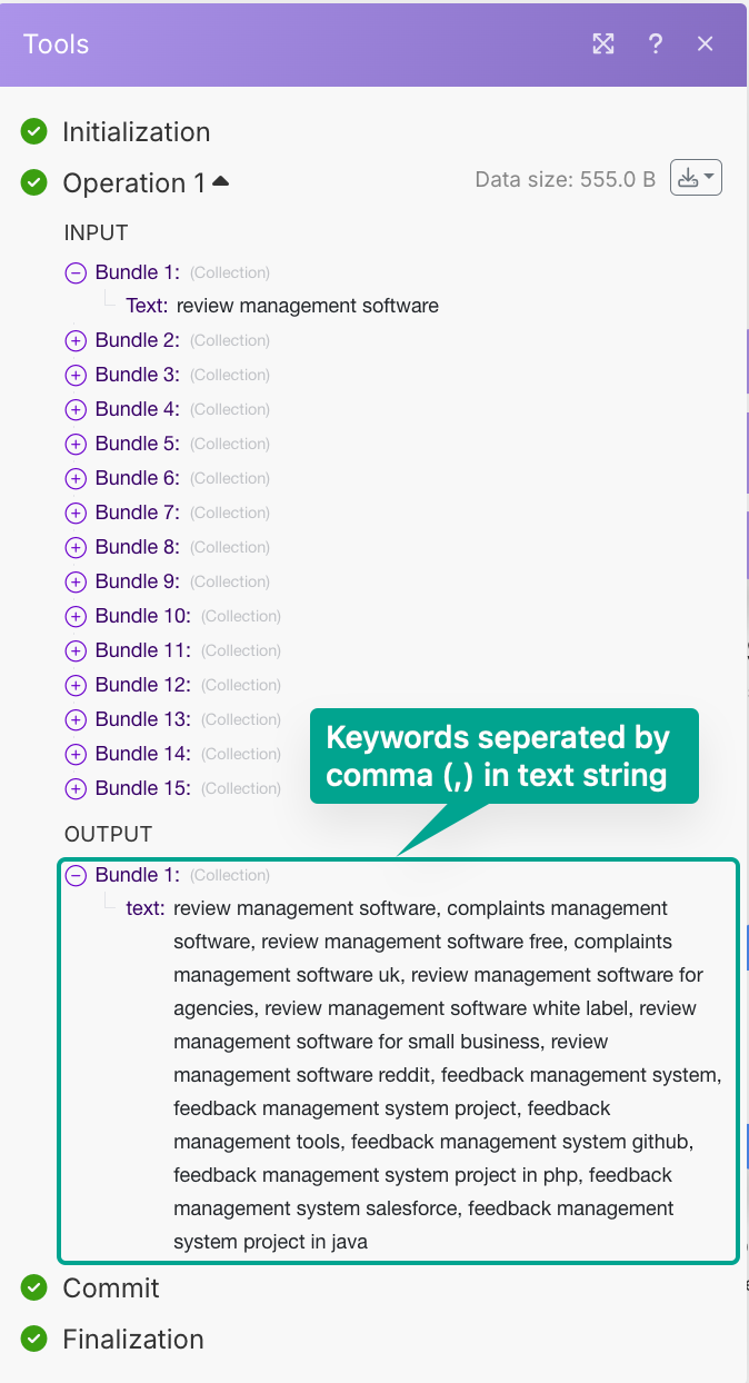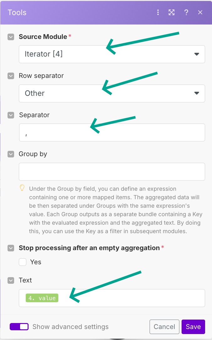 Now we need to aggregate all these keywords into one text string, the module we will use is ‘Text Aggregator’.