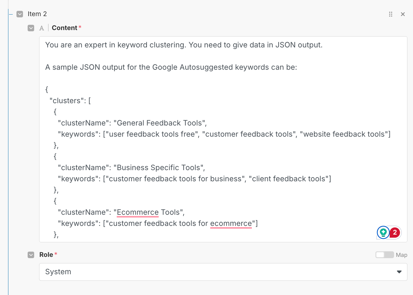 For the System prompt, we will give a sample JSON output data (we want to get the data in JSON format, that way it would be easy to move that data into our next corresponding modules.)