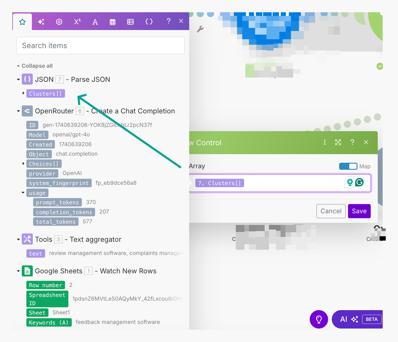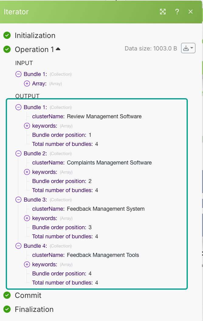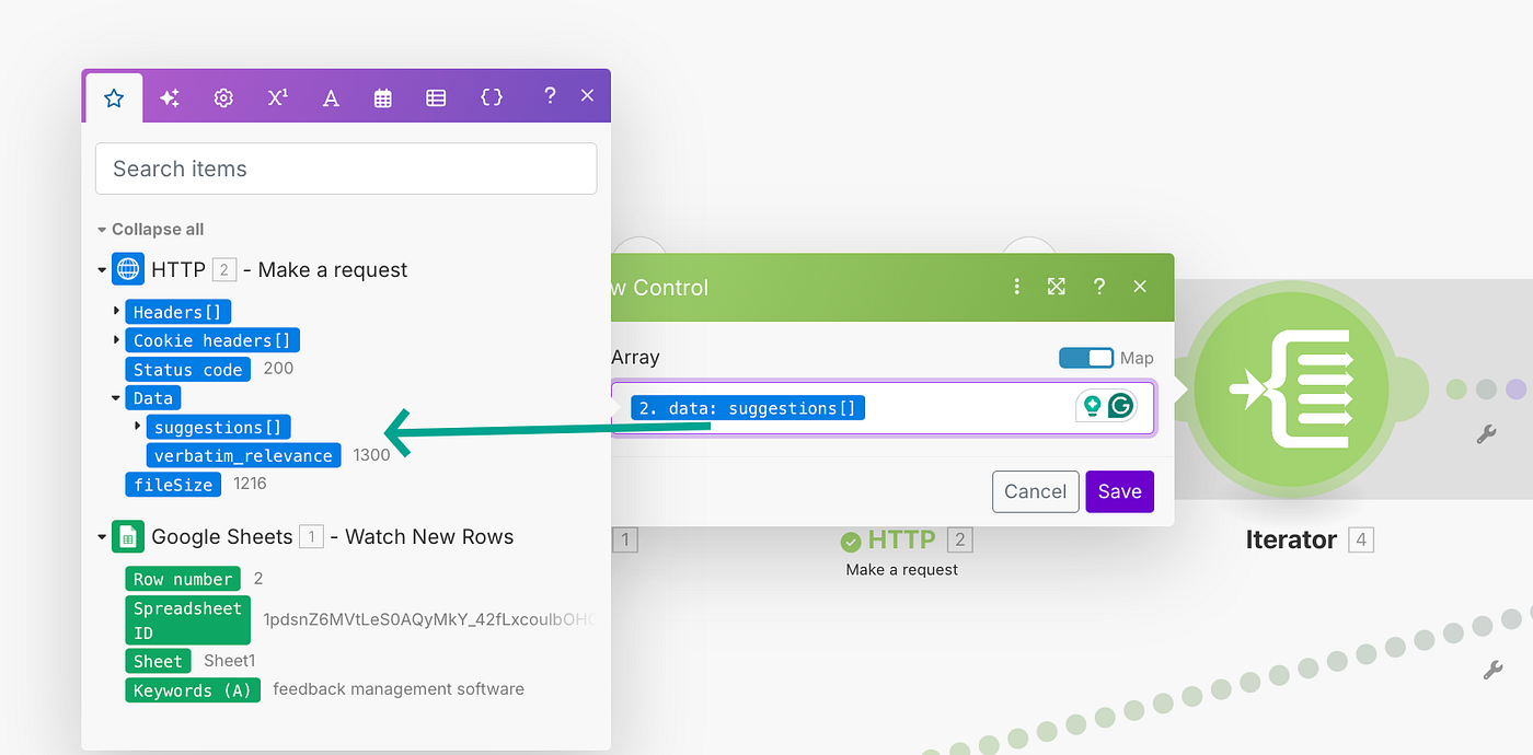 The next module will be an iterator, which will iterate on the Array of Google suggestions we received in the previous module.