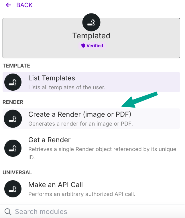 Back to our scenario, add a new module ‘templated’ and choose ‘create a render’