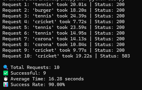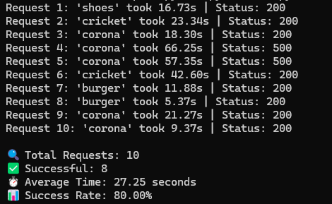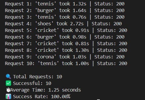 print(f"Request {i+1}: '{search_term}' took {request_time:.2f}s | Status: {response.status_code}")