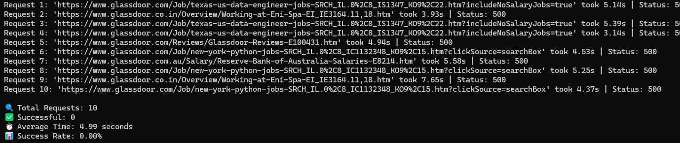 - 0% success rate with an average response time of 4.99 seconds on Glassdoor.