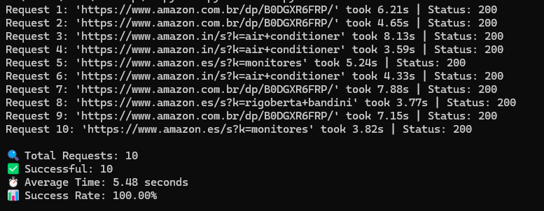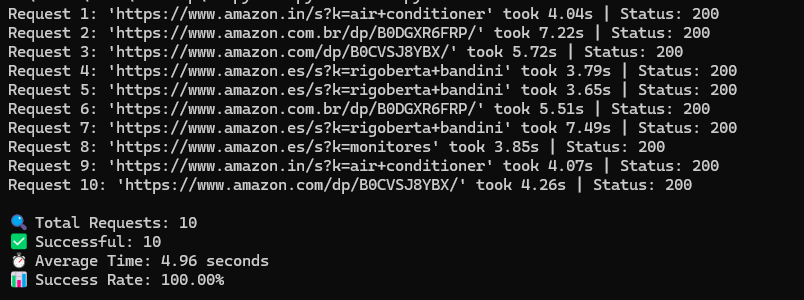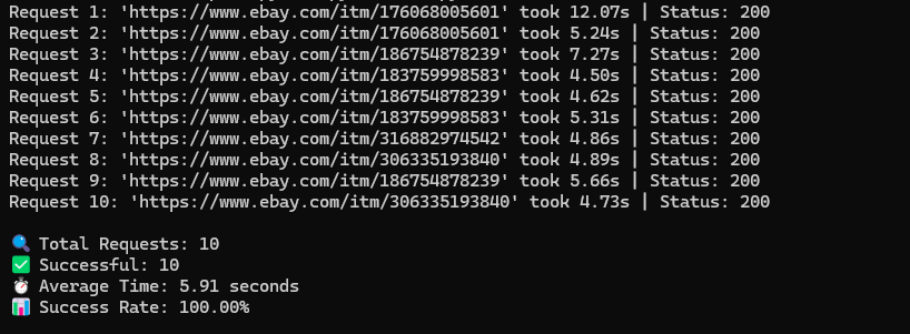 - Achieved a 100% success rate with an average response time of 5.91 seconds on eBay.