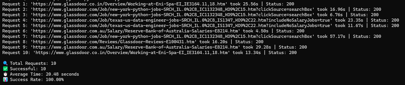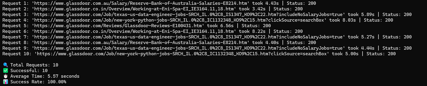 - Achieved a 100% success rate with an average response time of 5.57 seconds on Glassdoor.