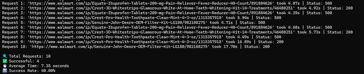 - 40% success rate with an average response time of 7.35 seconds on Walmart.
