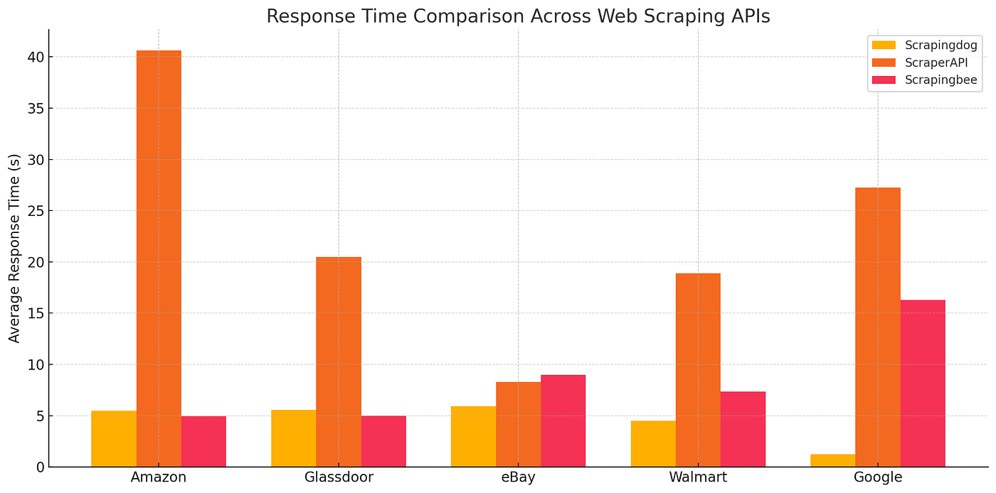 - Scrapingdog consistently outperforms both ScraperAPI and Scrapingbee in terms of speed across all tested websites, especially on Google, with a remarkable 1.25s response time.