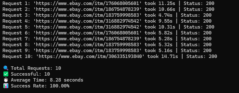 - 100% success rate with an average response time of 8.28 seconds on eBay.