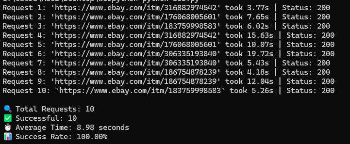 - 100% success rate with an average response time of 8.98 seconds on eBay.