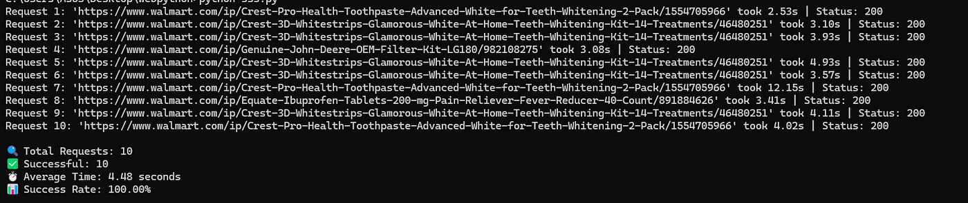 - Achieved a 100% success rate with an average response time of 4.48 seconds on Walmart.