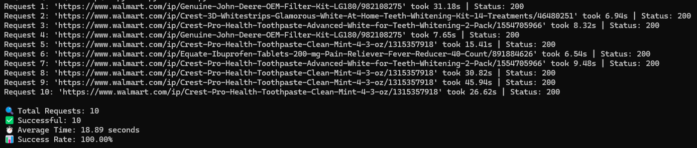 - 100% success rate with an average response time of 18.89 seconds on Walmart.