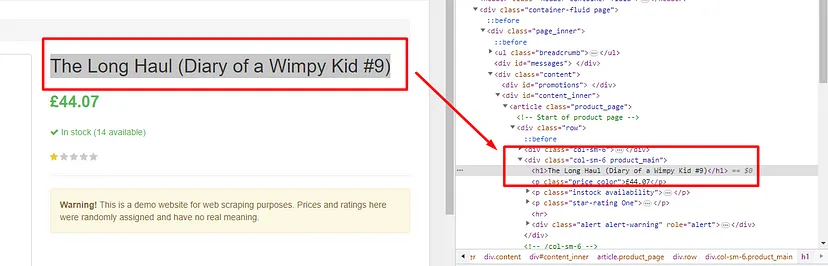 yield { ... }: This line starts a dictionary comprehension enclosed within curly braces. This dictionary will be yielded as the output of the method, effectively passing the extracted data to Scrapy’s output pipeline."title": response.css(".product_main h1::text").get(): This line extracts the text content of the<h1>element within the.product_mainclass using a CSS selector. The::textpseudo-element is used to select the text content. The.get()method retrieves the extracted text."price": response.css(".price_color::text").get(): This line extracts the text content of the element with the.price_colorclass, similar to the previous line."availability": response.css(".availability::text")[1].get().strip(): This line extracts the text content of the third element with the.availabilityclass on the page.[2]indicates that we’re selecting the third matching element (remember that indexing is zero-based). The.get()method retrieves the text content. Thestrip()function is used to remove the white spaces.