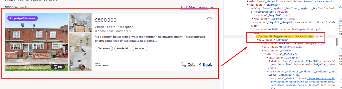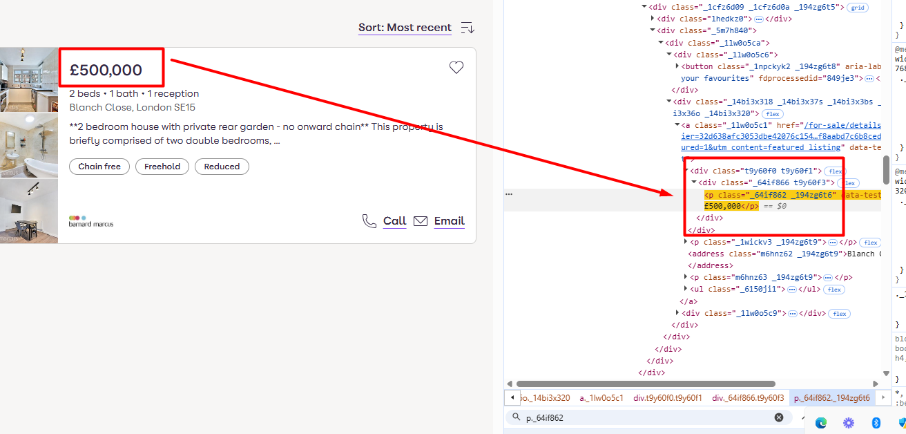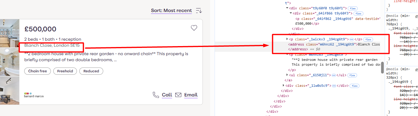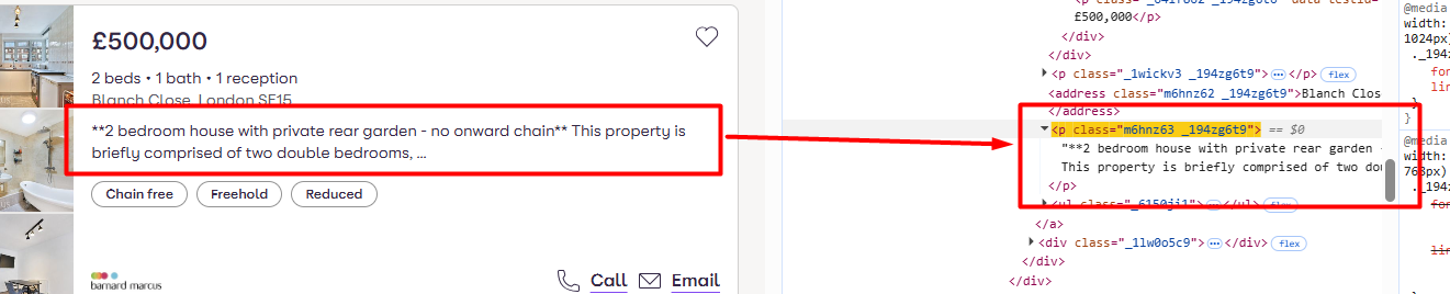 We are going to scrape the price, address, and description of the property. Let’s find the location of each data point in the DOM.
