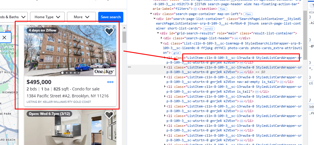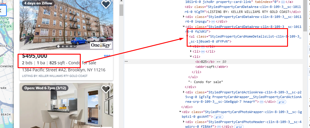 Similarly, you can see that the property size is located inside a ul tag with the class StyledPropertyCardHomeDetailsList-c11n-8–109–3__sc-1j0som5–0.