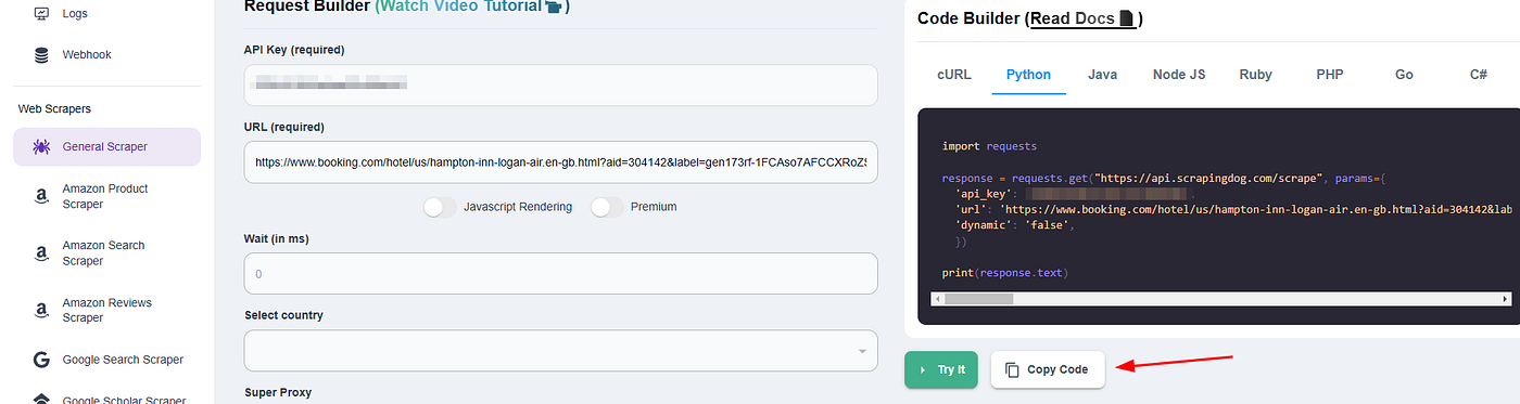 Click on General Scraper and enter your target booking.com link. This step will create a ready Python snippet on the right.