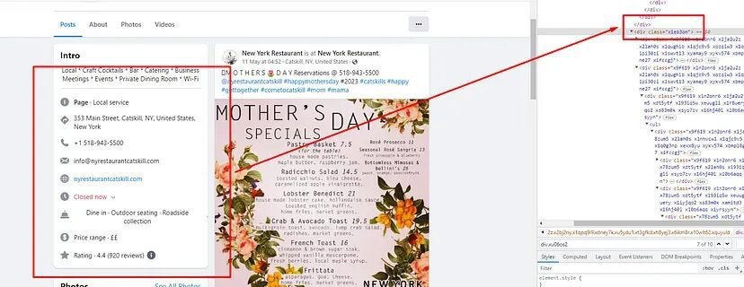 target_urlvariable holds the URL of the Facebook page you want to scrape. In this case, it is set to'https://www.facebook.com/nyrestaurantcatskill/'. puppeteer.launch({headless:false})launches a Puppeteer browser instance with theheadlessoption set tofalse. This means that the browser will have a visible UI when it opens. If you setheadlesstotrue, the browser will run in the background without a visible interface.browser.newPage()creates a new browser tab (page) and assigns it to thepagevariable.page.setViewport({ width: 1280, height: 800 })sets the viewport size of the page to 1280 pixels width and 800 pixels height. This simulates the screen size for the scraping operation.page.goto(target_url, {waitUntil: 'domcontentloaded'})navigates thepageto the specifiedtarget_url. The{waitUntil: 'domcontentloaded'}option makes the function wait until the DOM content of the page is fully loaded before proceeding.- The