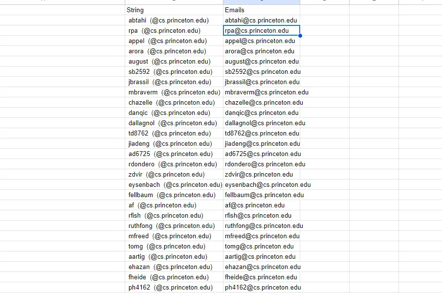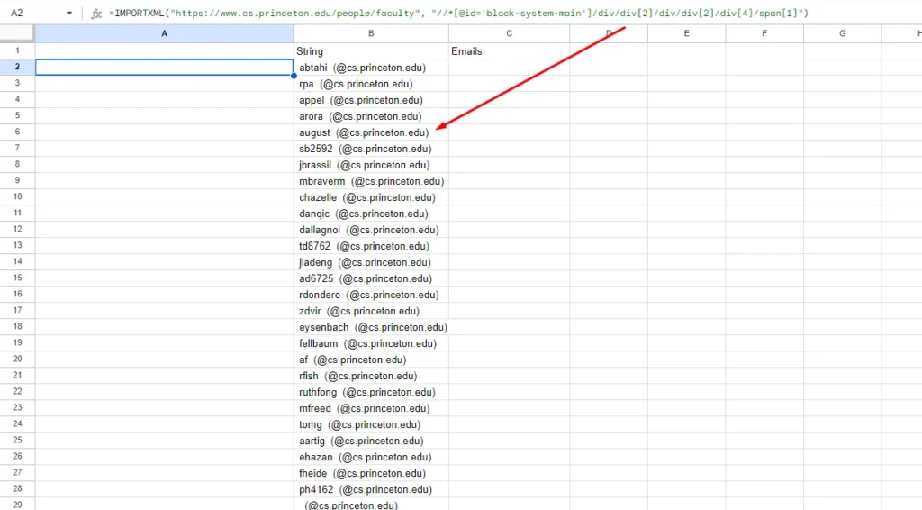 In this example, I will scrape the emails of faculty members of Princeton University. We will use built-in functions like IMPORTHTML and IMPORTXML of Google Sheets to scrape and parse the results. I would recommend you to read web scraping with Google Sheets before proceeding with this section.