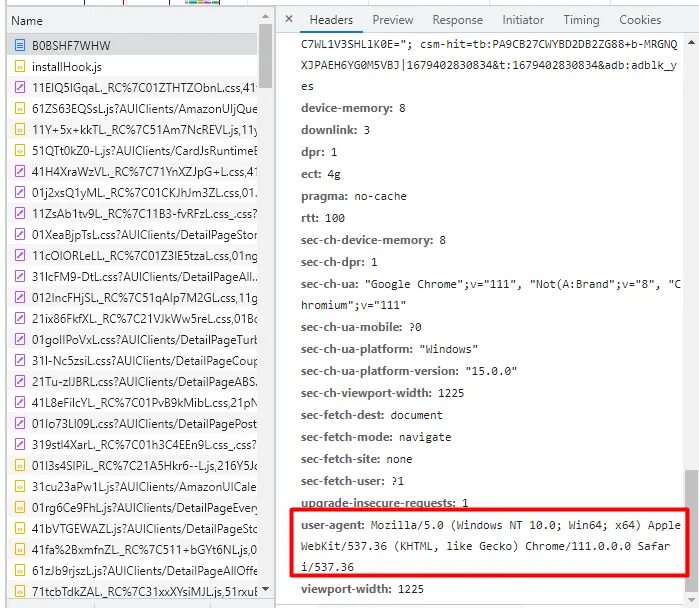 To bypass this on-site protection of Amazon we can send some headers like User-Agent. You can even check what headers are sent to amazon.com once you open the URL in your browser. You can check them from the network tab.