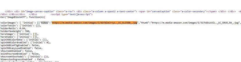 All this information is stored inside a script tag. Now, here we will use regular expressions to find this pattern of hiRes”:”image_url”