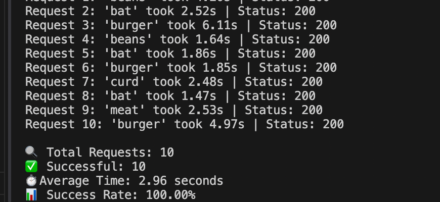 - We got 100% success rate with an average response time of 2.96 seconds.